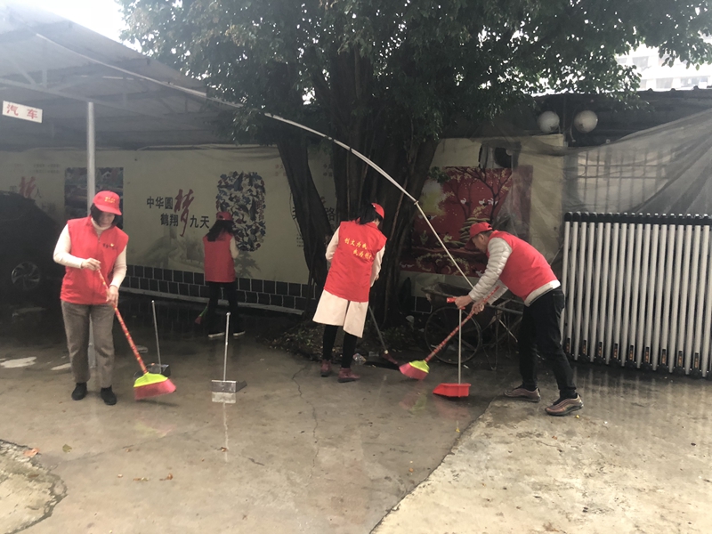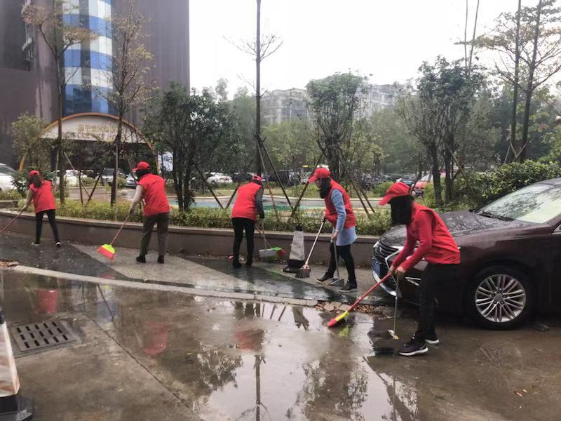3月5日下午,天下著毛毛雨,志愿者們身著紅馬甲,拿著掃把、靶子等工具,對停車場、小公園地面的落葉、雜物進行全面清掃,對一些死角進行清除。志愿者們不怕冷,不怕累,經過長達2個小時的努力,把小公園及停車場打掃得干干凈凈。